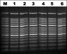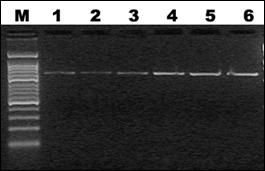 图2. SM1-015A磁珠纯化PCR片段(~800bp )。泳道1,4为起始样本;泳道2-3,5-6为纯化后的样本(电泳时1-3上样量均为4ul, 4-6上样量均为4ul 。起始样本体积50ul,纯化后洗脱体积50ul)
