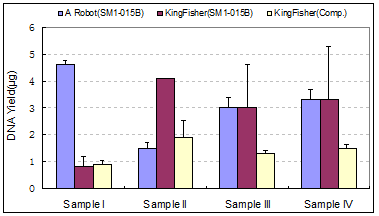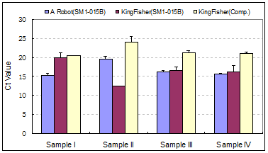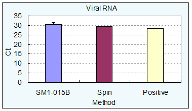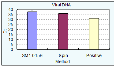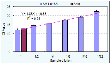 图SM1-015B磁珠在I公司试剂体系中提取全血基因组DNA的量和荧光PCR检测的结果。比较了不同公司试剂在不同的自动化仪器上的使用情况,A Robot(SM1-015B)表示I公司试剂盒在自动化仪器A Robot上的应用, Kingfisher(SM1-015B)表示I公司试剂盒在自动化仪器Kingfisher上的应用,Kingfisher(Comp.)表示其他公司试剂盒在自动化仪器Kingfisher上的应用。Sample I—IV为-20℃保存不同年数的人全血样本。本数据由客户提供。 图 SM1-015B磁珠在I公司试剂体系中提取HBV DNA的效果。Spin method为离心柱方法提取的HBV DNA(两次重复),SM1-015B为自动化仪器上的测试结果(12次重复)。该实验结果由客户提供。 图 SM1-015B磁珠在I公司试剂体系中提取Influenza A RNA的效果。Spin method为离心柱方法提取的HBV DNA(两次重复),SM1-015B为自动化仪器上的测试结果(12次重复)。该实验结果由客户提供。 图 SM1-015B在I公司细菌基因组DNA提取试剂体系中提取不同稀释梯度的细菌样本,每种浓度的样本重复3次,用离心柱方法做对照,提取的DNA用做荧光PCR检测。