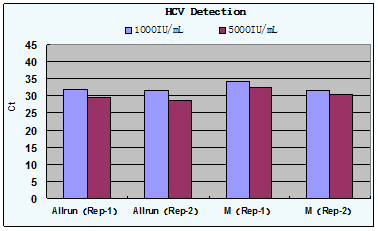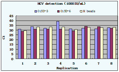图 SM1-015D磁珠在K公司病毒DNA/RNA提取试剂体系中提取的血清中HCV RNA的荧光RT-PCR检测结果,测试结果在相同条件下与M公司磁珠进行了对比。血清中HCV的浓度分别为1000IU/mL和5000IU/mL。