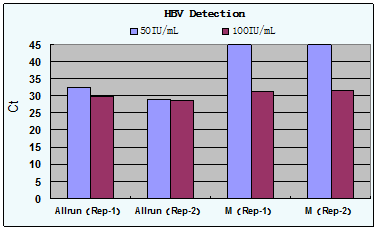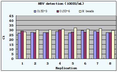 图 SM1-015D磁珠在K公司病毒DNA/RNA提取试剂体系中提取的血清中HBV DNA的荧光PCR检测结果,测试结果在相同条件下与M公司磁珠进行了对比。血清中HBV的浓度分别为50IU/mL和100IU/mL。