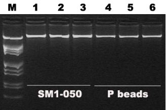 图2. SM1-050磁珠和P公司磁珠在AllMagTM试剂体系中(产品编号A10301),提取人全血基因组DNA。Lane M1:λDNA Marker (EcoRI + Hind III digestion);Lane 1-3:SM1-050磁珠(1mg)提取的基因组DNA;Lane 4-6:P公司磁珠(5mg)提取的基因组DNA。