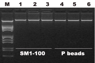 图2. SM1-100磁珠和P公司磁珠在AllMag试剂体系中(产品编号A10301),提取人全血基因组DNA。Lane M1:λDNA Marker (EcoRI + Hind III digestion);Lane 1-3:SM1-100磁珠(1mg)提取的基因组DNA;Lane 4-6:P公司磁珠(5mg)提取的基因组DNA。