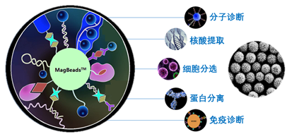 基于高性能磁珠表面的抗原-抗体、DNA互补、亲和素-生物素、酶-底物等特异性反应,可用于识别、捕获、标记、分离、检测、信号放大、催化等功能构建,包括核酸提取、文库构建、DNA探测与传感、纯化PCR产物、核酸转染、抗体纯化、细胞分选与检测、特定蛋白分离、糖蛋白分离、GST融合蛋白分离、酶联免疫检测、化学发光检测、免疫沉降-蛋白质免疫印记分析、多元免疫检测、病原微生物捕获与检测、酶固定化与级联酶固定等众多应用。围绕磁性微球,本公司专家团队可以根据客户需求提供个体化的综合解决方案及定制服务,满足客户在分离、检测等领域的创新应用。