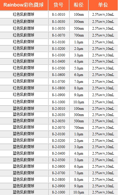 Rainbow 彩色乳胶微球Rainbow单分散乳胶微球是通过在聚苯乙烯微球基质或表面上结合发色基团制备而成。可提供从纳米到微米范围的粒径可调,具有不同官能团和不同颜色染料的单分散乳胶微球。Rainbow乳胶微球具有色彩艳丽,性能稳定,粒径分布窄等特性,可广泛应用于显微测定,免疫检测,凝集反应等各种检测中。