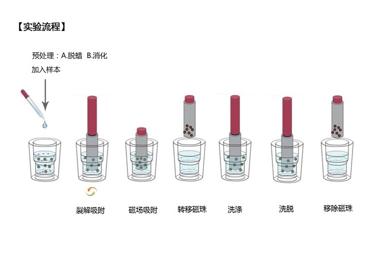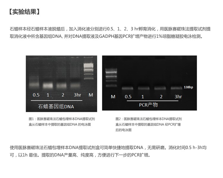 用于石蜡包埋组织基因组DNA提取。试剂盒不使用二甲苯作为石蜡溶剂, 从而增加操作环境的安全性;经过独特的表面修饰的磁珠,结合核酸能力更强,洗脱更容易;操作步骤简单,适合于基因组DNA的磁珠自动化提取过程。本试剂盒纯化的基因组DNA可适用于各种下游操作,包括PCR、文库构建、Southern杂交、基因测序等实验。