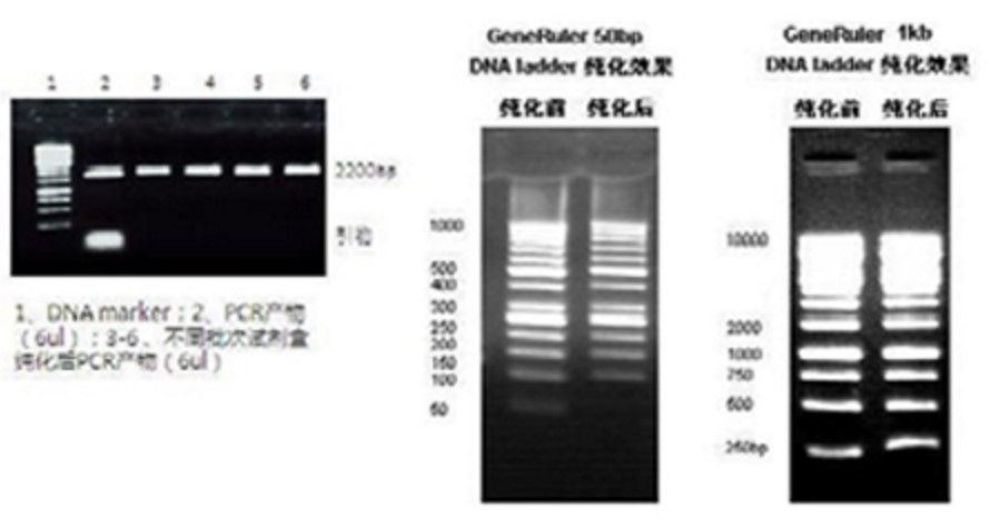 试剂盒用于纯化回收 100bp 及以上的 DNA 片段,操作简捷快速、回收效率高, 回收后的 DNA 产物不含引物、蛋白、单核苷酸、荧光染料或放射性同位素标记的单核苷酸, 可直接应用于基因测序、连接、酶切、限制性分析、体外转录、Southern 印迹杂交等各种分子生物学实验。