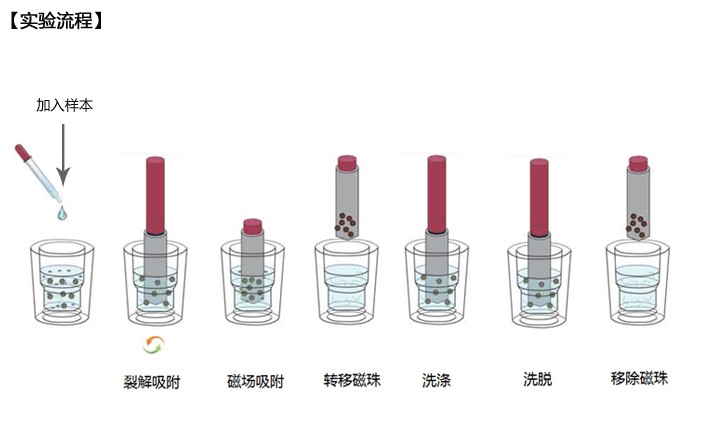 本试剂盒用于提取血清、 血浆、 咽拭子等液体样本中的病毒核酸( DNA)。试剂盒由高效吸附核酸的超顺磁性纳米微球和安全环保的提取试剂体系组成:经过独特的表面修饰的磁珠,结合核酸能力更强;只使用一种溶液同时裂解细胞并使 DNA 成分与磁珠结合;洗脱容易,使用 TE 缓冲液或水即可将病毒 DNA 从磁珠洗脱下来;操作步骤简单,操作时间短,整个操作过程都在室温下进行,因此也非常适合于病毒 DNA 的磁珠自动化提取过程。