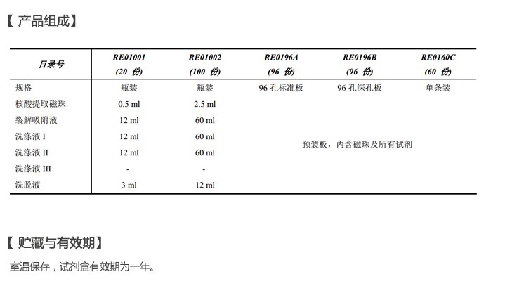 用于提取血清/血浆/咽拭子等液体样本中病毒核酸(RNA),试剂盒是高效吸附核酸的超顺磁性纳米微球和提取试剂体系组成;经过独特的表面修饰的磁珠,结合核酸能力更强、洗脱更容易;操作步骤简单,操作时间短,室温提取过程,适合于快速核酸提取的磁珠自动化过程。